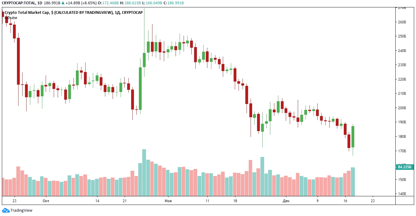 На графике рыночной капитализации уровень в $200 000 000 000 являлся сильным сопротивлением, и после того, как капитализация остановилась на этой цифре, начался устойчивый спад. Рыночная капитализация снизилась более чем на $20 000 000 000 и опустилась ниже $180 000 000 000.