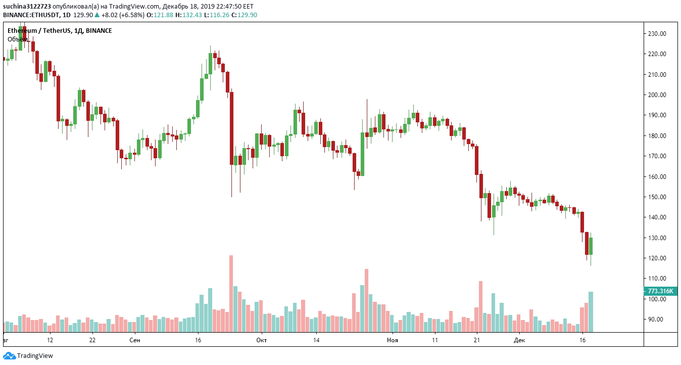 Вторая по значимости криптовалюта Эфириум потеряла в цене за последние три дня почти столько же, сколько и криптовалюта Трон. Снижение составило около 19% и было пробита важная поддержка. Сейчас цена находится на $117. Будет ли падение продолжается, не ясно, но следующий важный уровень - $105.