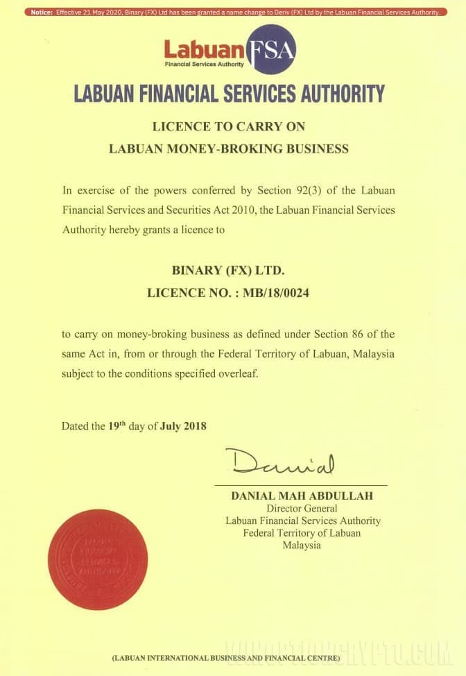 Deriv (FX) Ltd (company number LL 13394) completed its registration on January 18, 2017, in the Federal Territory of Labuan, Malaysia. The legal address is Unit No. 3A-16, Level 3A, Labuan Times Square, Jalan Merdeka, 87000, Federal Territory of Labuan, Malaysia.