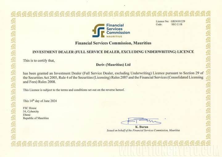 Deriv (Mauritius) Ltd (company number 209524) completed its registration in the Republic of Mauritius on June 11, 2024. The legal address is The Cyberati Lounge, Ground Floor, The Catalyst, Silicon Avenue, 40 Cybercity, 72201 Ebène, Republic of Mauritius.