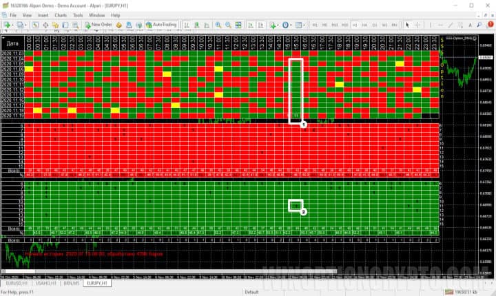 At the same time, the bottom part of chart (2) shows that during the history of analysis (3), there were only two such cases, and nine times in a row, there were no red candles at all! It is logical to assume that now, after eight red candles, there will be a green one, which means that the next day, during this period, we will need to buy a CALL option to bet on the increase in the price.