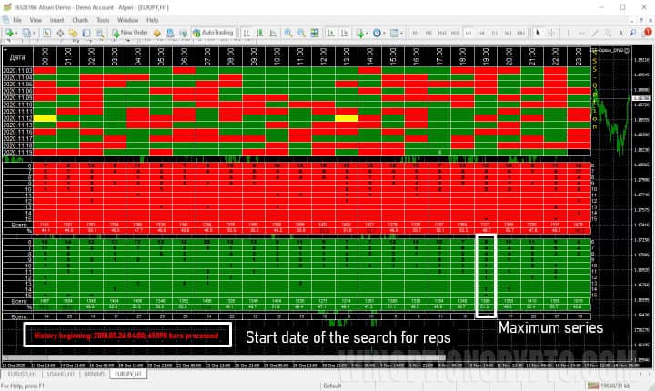 By setting this parameter to 1, the indicator will only display those series when the current series differs from the maximum by 1 day. For example, in EUR-USD at noon, the maximum series of green candles, starting from 2010, was 10 days in a row. By setting the tolerance to 1, the indicator will signal when the series gets as close as possible to this value and reaches 9 days in a row.