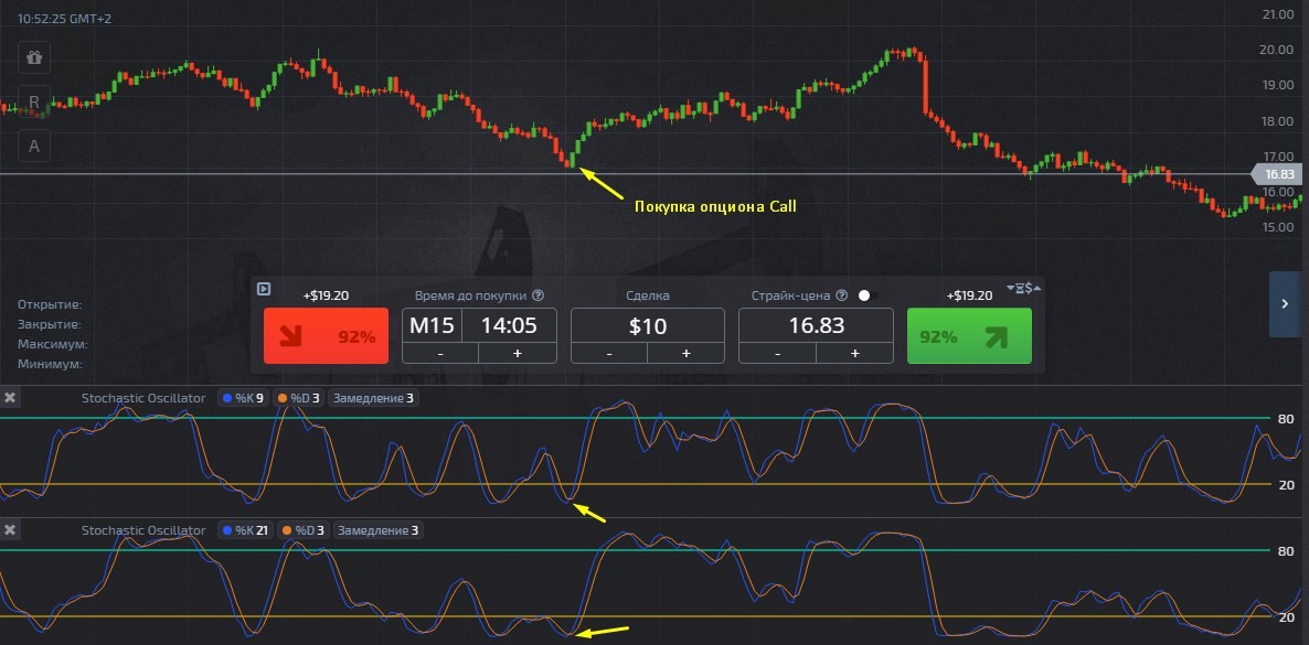 - Signal lines are leaving the overbought and oversold zones. As soon as the fast moving average crosses level 20 from bottom to top (the slow moving average also moves upward at this moment), a deal to buy a Call option should be opened immediately after the current candle closes. Orders for Put contracts are placed in the opposite situation. These options need to be bought if the fast line crosses the 80 level from top to bottom (the second moving average also leaves the overbought zone).