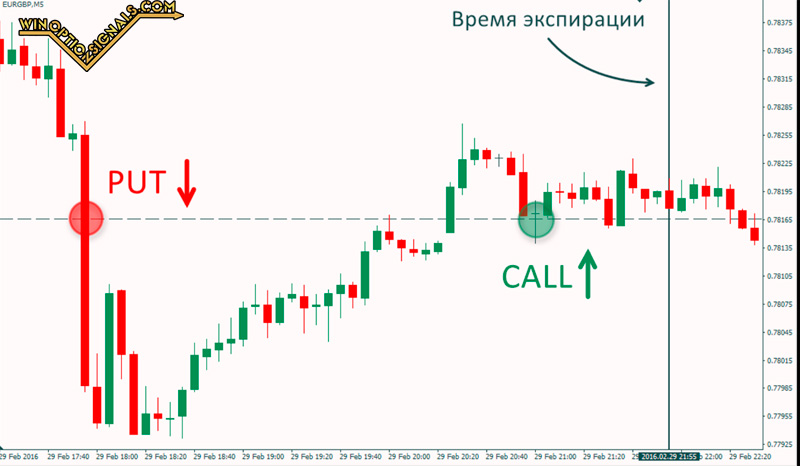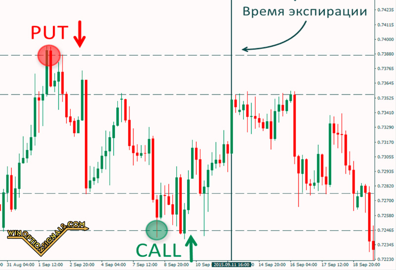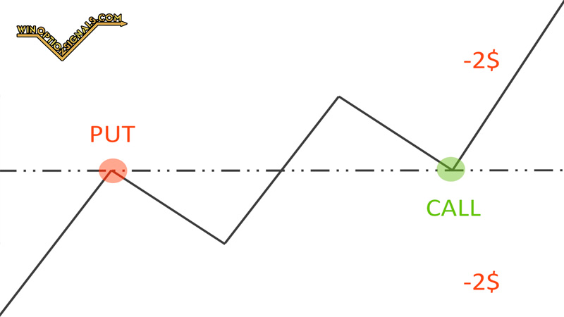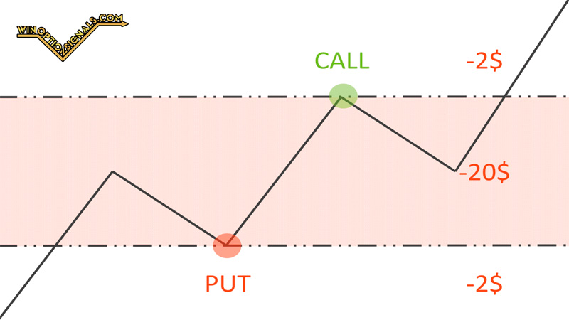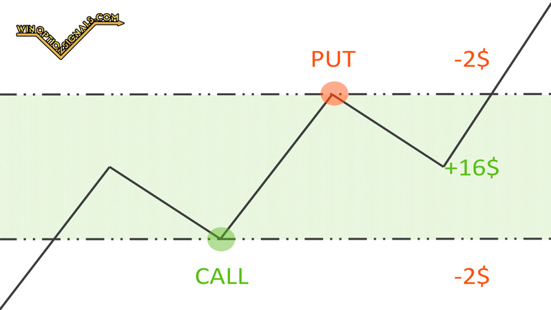 Для заключения сделок находят максимум и минимум за определенный период, открывая соответственно позиции Put или Call внизу и вверху канала. Торговля осуществляется в ценовом коридоре, особенно такой подход эффективен при незначительных колебаниях. Чаще всего обе ставки оказываются доходными.