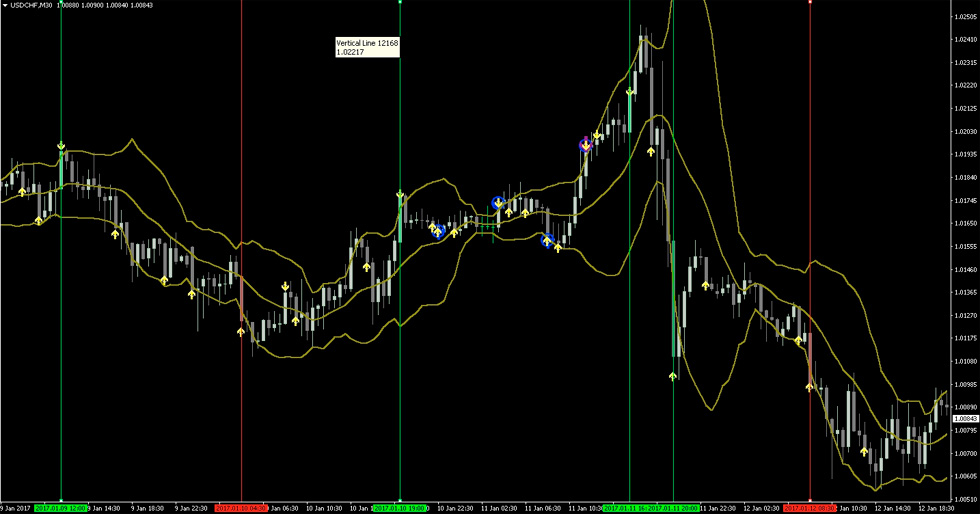 Валютная пара USDCHF на М30 наглядно показывает, что пересечение свечой крайних границ Bollinger Bands — не всегда достаточная гарантия для доходной ставки. Риск получения убытка снижается, если тело сигнальной свечи целиком выходит за пределы линий индикатора Bollinger Bands – повышается вероятность отката.