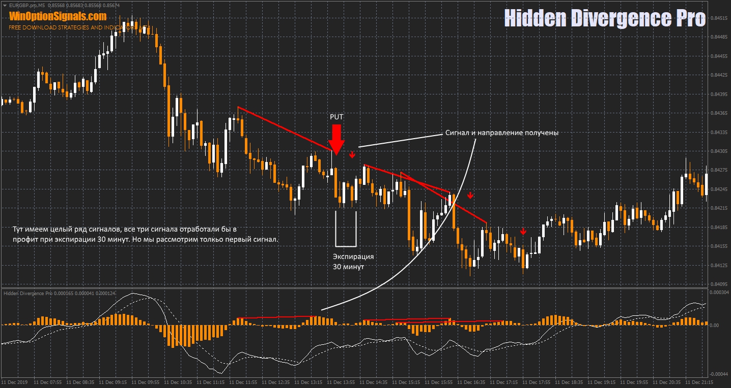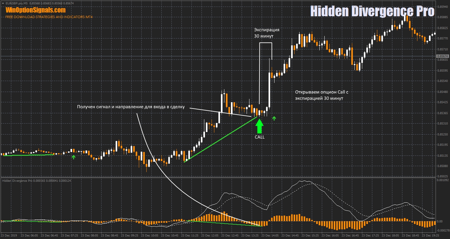 Индикатор Hidden Divergence Pro, как понятно из названия, предназначен для отслеживания дивергенций. Изначально он создавался для рынка Форекс, но его легко можно применять и для торговли бинарными опционами.
