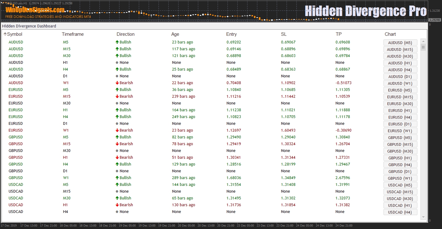 Вместе с индикатором дивергенций есть еще один полезный инструмент. Это Hidden Divergence Pro. Установив данный индикатор, мы получаем максимум информации о всех дивергенциях по различным валютным парам и тайм фреймам. При чем не важно, на каком тайм фрейме или инструменте вы установлен этот индикатор. И ко всему остальному можно переключаться между инструментами на самой панели.
