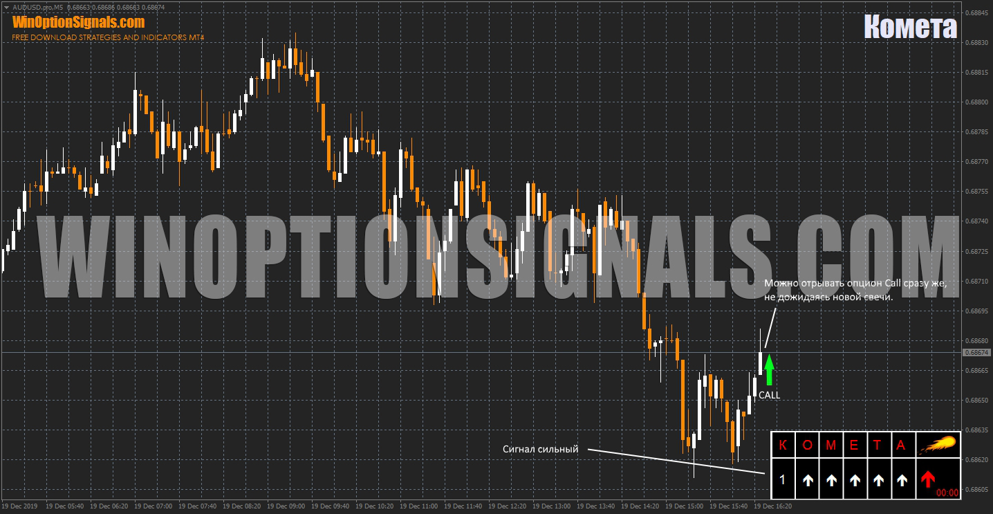 Индикатор для бинарных опционов Комета является сигнальным и не занимает много места на графике, тем самым позволяя дополнять его и создавать торговые стратегии на основе данного индикатора. Хотя этот индикатор был разработан, как полноценный инструмент, не требующий фильтров. Придерживаясь всех правил, у вас будет возможность получать до 80% положительных сделок.