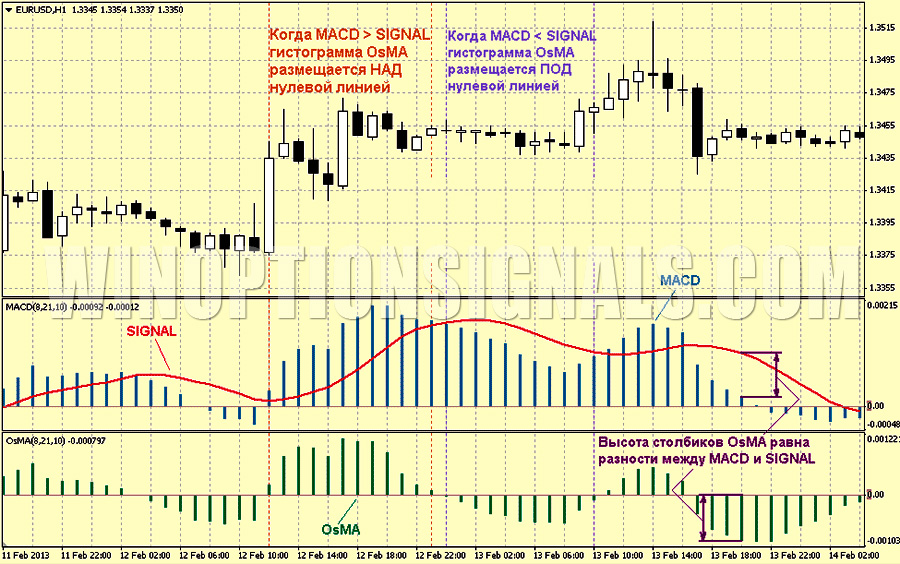 Ситуация, когда столбцы MACD расположены выше сигнальной линии, будет аналогична ситуации, при которой столбцы OsMA будут выше нулевого уровня. Если линия MACD проходит выше столбцов, то гистограмма OsMA будет находиться ниже нулевого уровня.