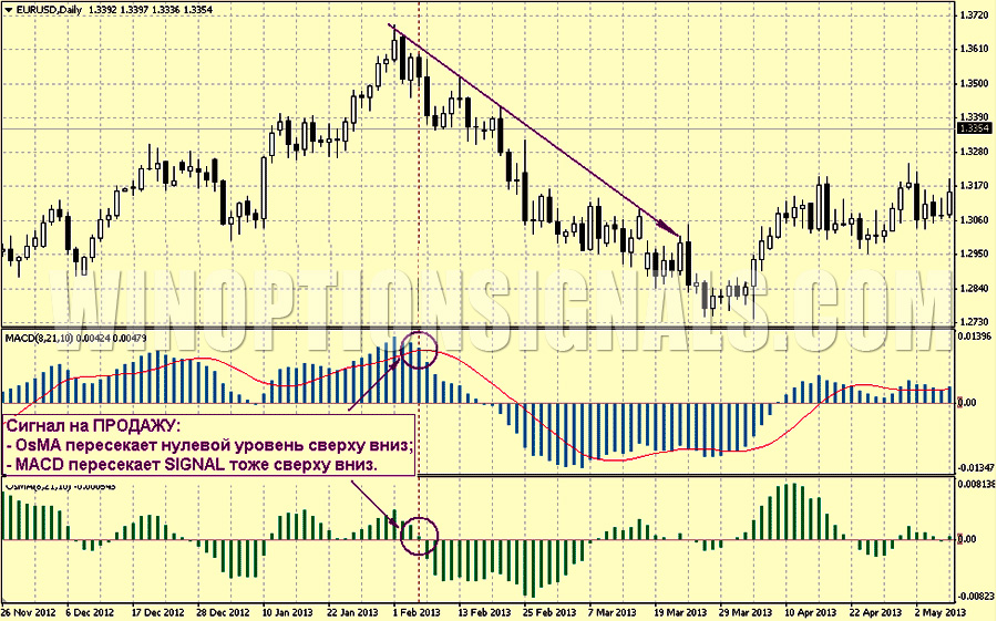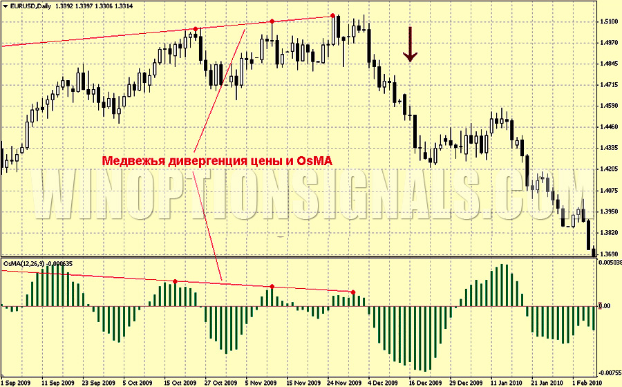 - Дивергенция на продажу. Формирование сигнала происходит аналогичным образом. Во время бычьего движения свечной график показывает несколько возрастающих пиков. Если гистограмма OsMA будет показывать понижающиеся максимумы, то самое время открывать позицию на понижение.