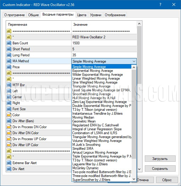 Как можно видеть из изображений выше, выбрать можно как метод построения MA для индикатора RED Wave Oscillator, так и тип цены, которая будет использоваться для построения.