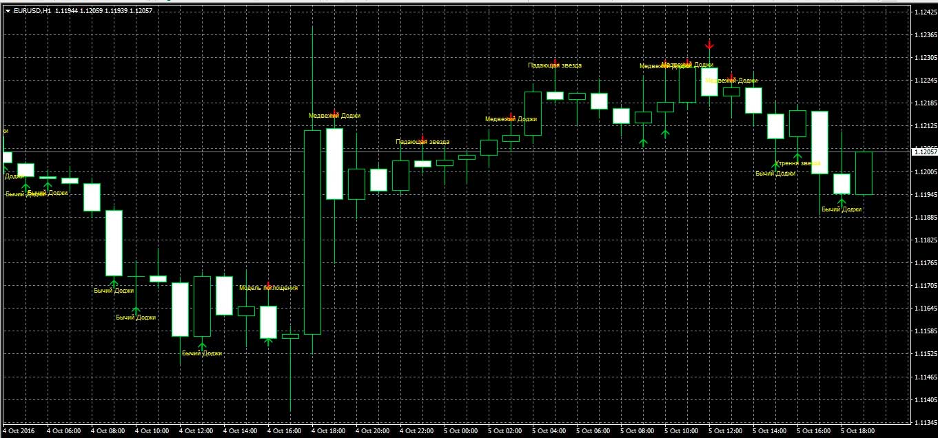 Данный индикатор показывает так же небольшое число комбинаций японских свечей, и отображает названия только при наведении на указатель, однако пользуется большой популярностью и весьма надежен в использовании.