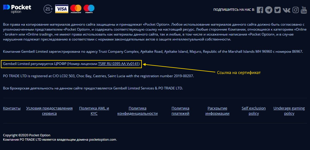 На официальном сайте брокера Покет Оптион в самом низу страницы можно найти любую дополнительную информацию и всю документацию, а также ссылку на сертификат:
