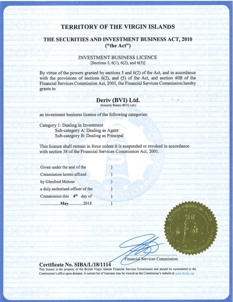 Ознакомиться с лицензиями от разных регуляторов можно на примере брокера Deriv, который предоставляет торговлю, как бинарными опционами, так и на рынке Форекс. У брокера имеется немало лицензий, благодаря которым он может осуществлять свою деятельность в разных странах, включая Европу и Азию: