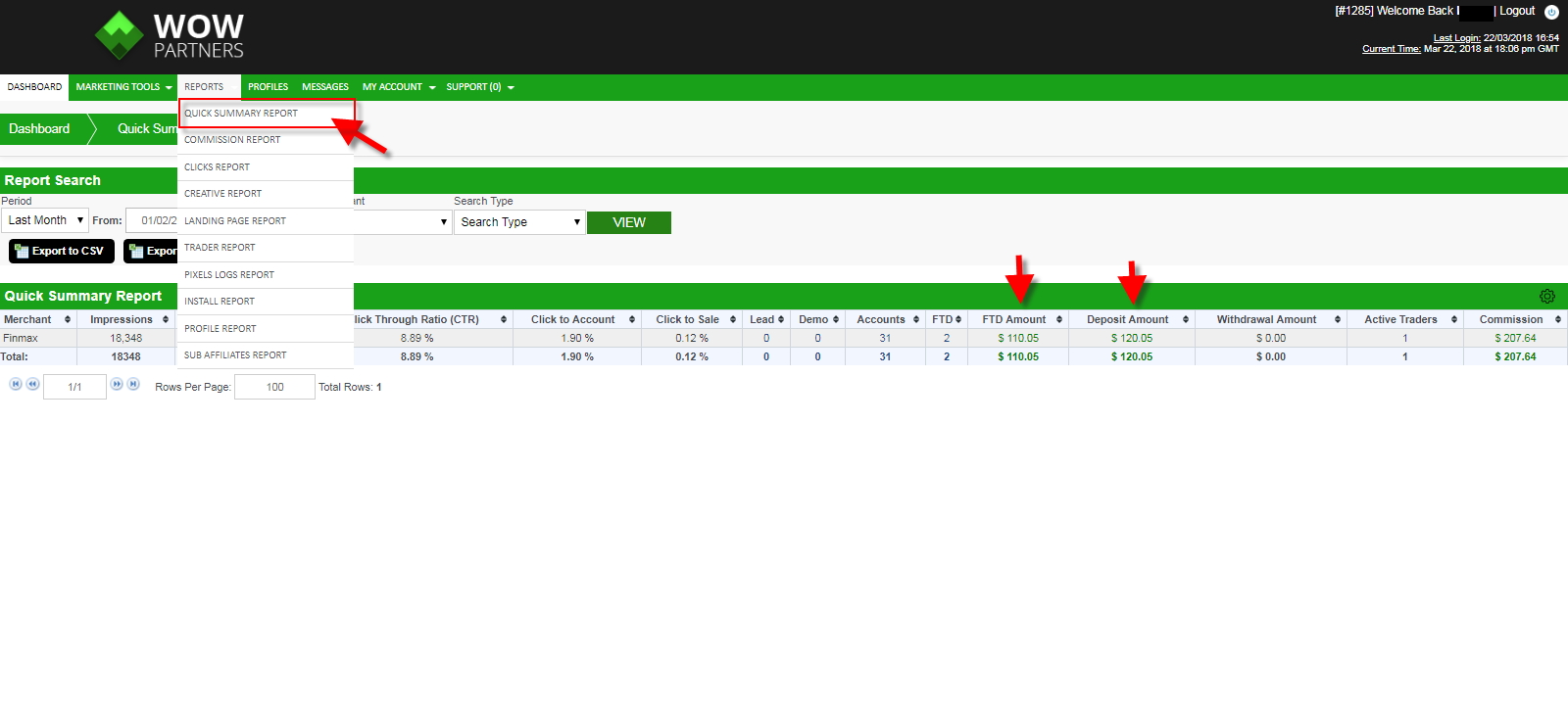 В разделе «Reports» и вкладке «Quick summary report» можно увидеть весь отчет за месяц, где показаны все депозиты привлеченных трейдеров: