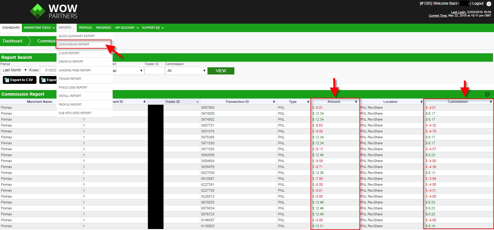 Во вкладке «Comission report» показаны результаты торговли по всем приглашенным трейдерам и заработок партнера за каждую сделку: