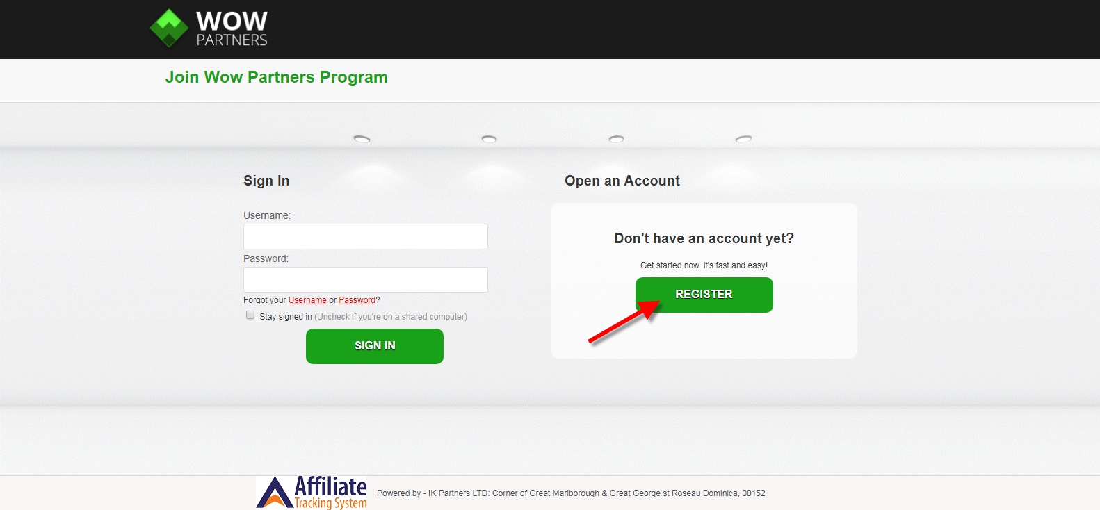 Для того, чтобы стать партнером брокера FiNMAX, потребуется зарегистрироваться на официальном сайте партнерской программы http://affiliate.wow-partners.com (не работает с AdBlock), нажав на кнопку «Register»: