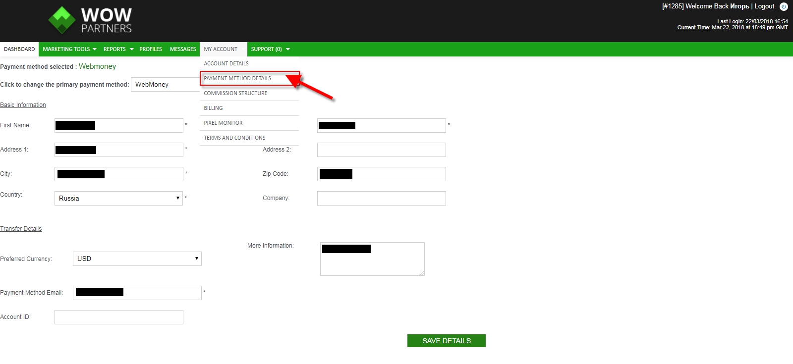 Чтобы выбрать платежную систему, необходимо перейти в раздел «My account» и во вкладке «Payment method details» выбрать ту, которая больше всего подходит: