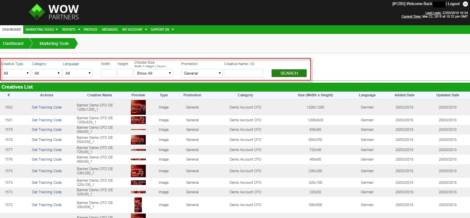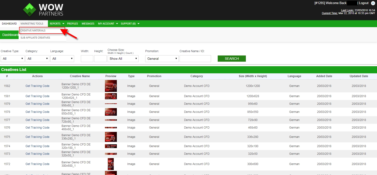 Баннеры и рекламные материалы для проведения кампании данной партнерки можно найти в разделе «Creative materials»: