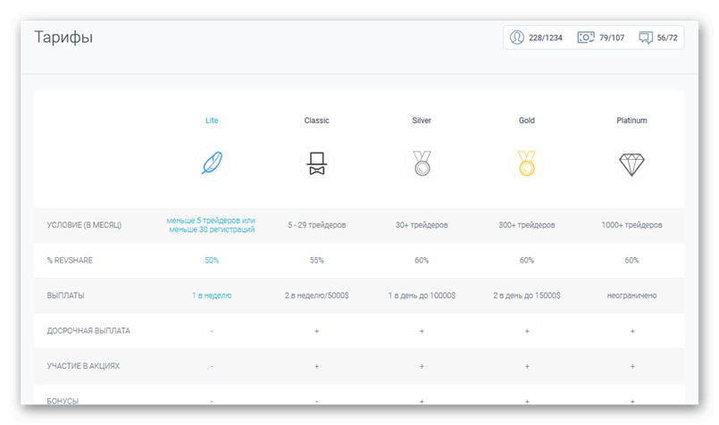 В партнерке OlympTrade существует четыре вида тарифов:
