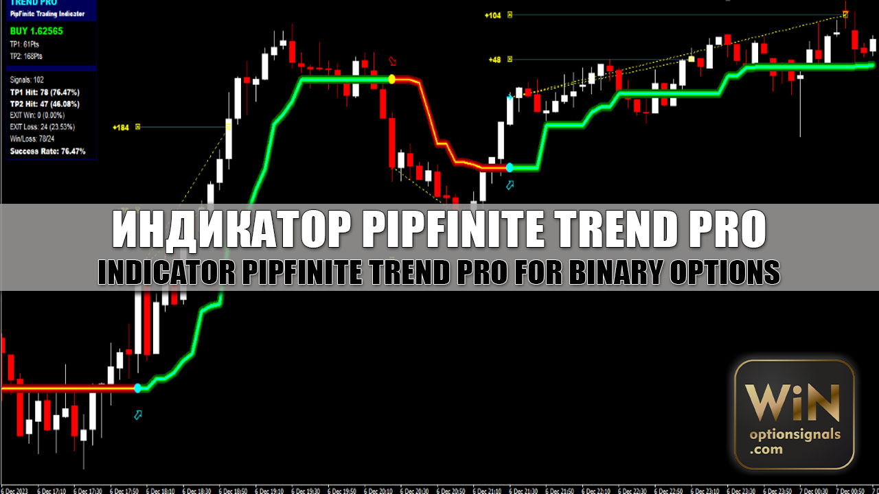 Индикатор для бинарных опционов PipFinite Trend PRO – очень перспективный и интересный инструмент технического анализа, способный существенно дополнить арсенал трейдера любого уровня квалификации. Точные сигналы о смене тенденции в сочетании с уровнями тейк-профита, куда с высокой вероятностью, подтвержденной фактической статистикой, достигнет цена не оставит равнодушным ни одного трейдера.
