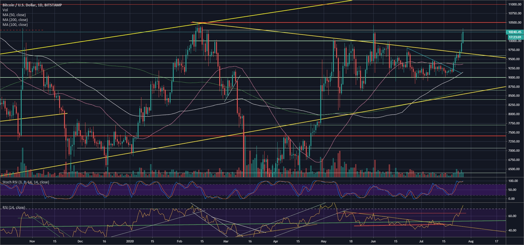 Если посмотреть на дневной график, то можно увидеть, что Биткоин пытался пробить отметку в $10 429 в начале июня и эта попытка закончилась огромным «дампом» до $8 600 на следующий день.