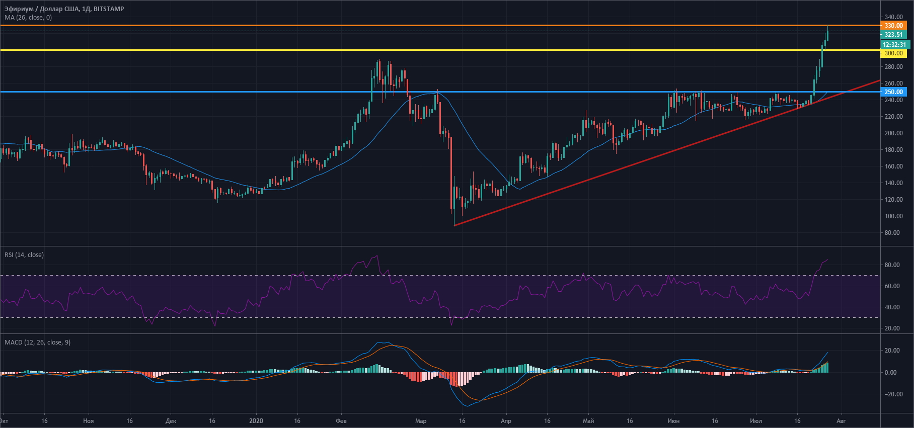 Следовательно, эти выходные дни принесли наибольшую прибыль Эфиру за последние три месяца. После пробития уровня $300, ETH продолжил сильный рост до новых максимумов 2020 года на уровне $330. Покупательская активность была все еще на высоком уровне, хотя незначительная коррекция привела цену к $321 (преобладающая рыночная стоимость). В то же время покупатели с нетерпением ждут максимумов выше $350 и $400: