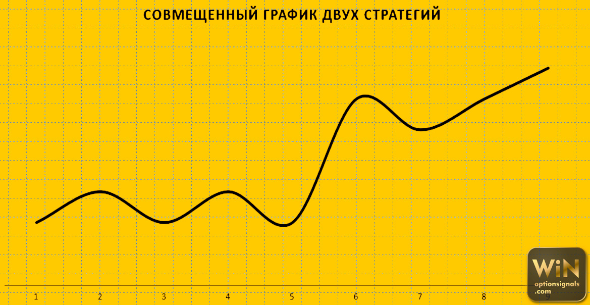 Получить преимущество перед рынком мы можем с помощью использования нескольких кардинально различающихся между собой подходов. Очень важно, чтобы они были мало коррелирующие. В рассматриваемом примере прибыль по второй стратегии покрывает убытки по первой. Нам остается только сложить прибыль по обеим стратегиям. В итоге мы увидим, что график доходности является вполне стабильным и не имеет существенных просадок.