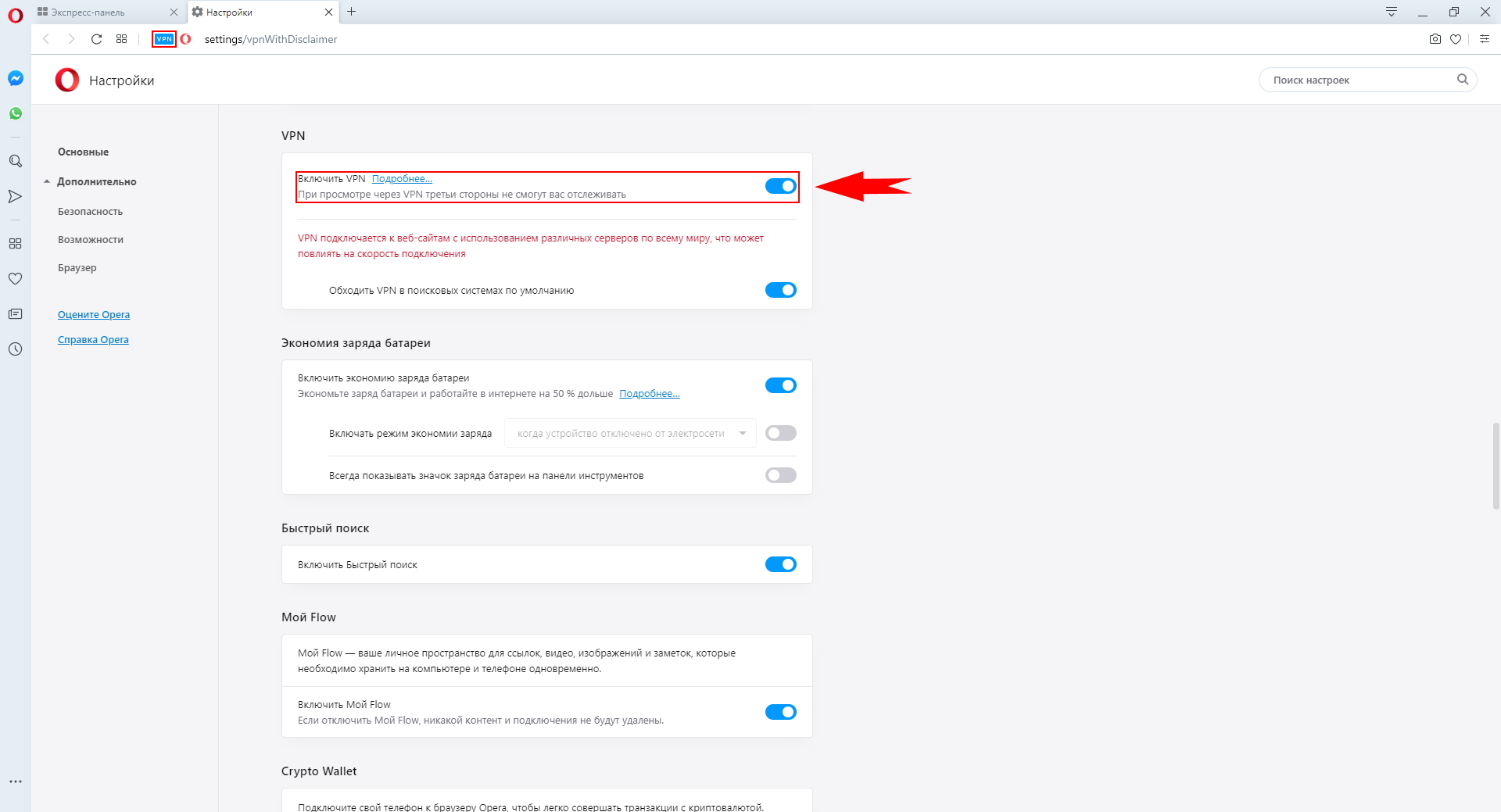 Тем, кто использует браузер Opera, можно обойтись без скачивания сторонних приложений. В нем уже встроен VPN, который можно запустить в настройках браузера. Для этого в правом верхнем углу кликните по значку «Простая настройка» и в появившемся меню найдите кнопку VPN «Разрешить в настройках»: