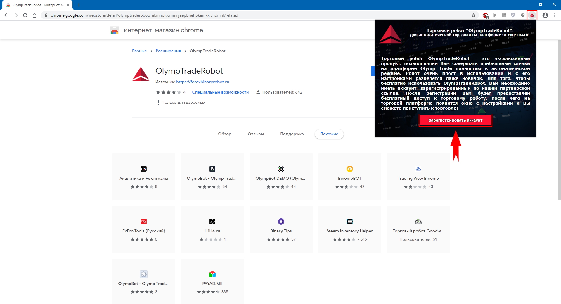 После установки приложения кликаем по появившемуся значку приложения OlympTradeRobot в правом верхнем углу браузера. В открытом окне можно ознакомиться с краткой информацией о роботе или сразу кликнуть на кнопку «Зарегистрировать аккаунт»: