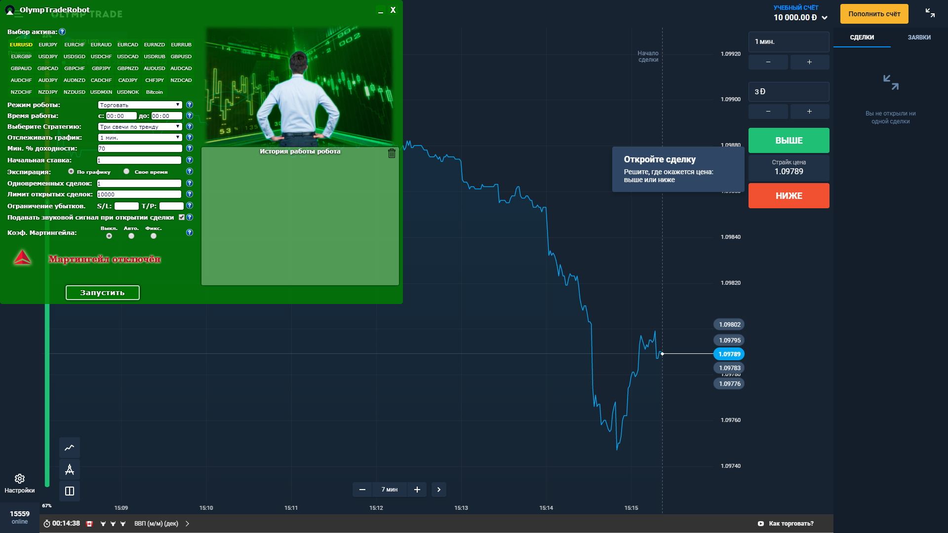 Закрыв окно бонуса, в левом верхнем углу появится торговая панель OlympTradeRobot: