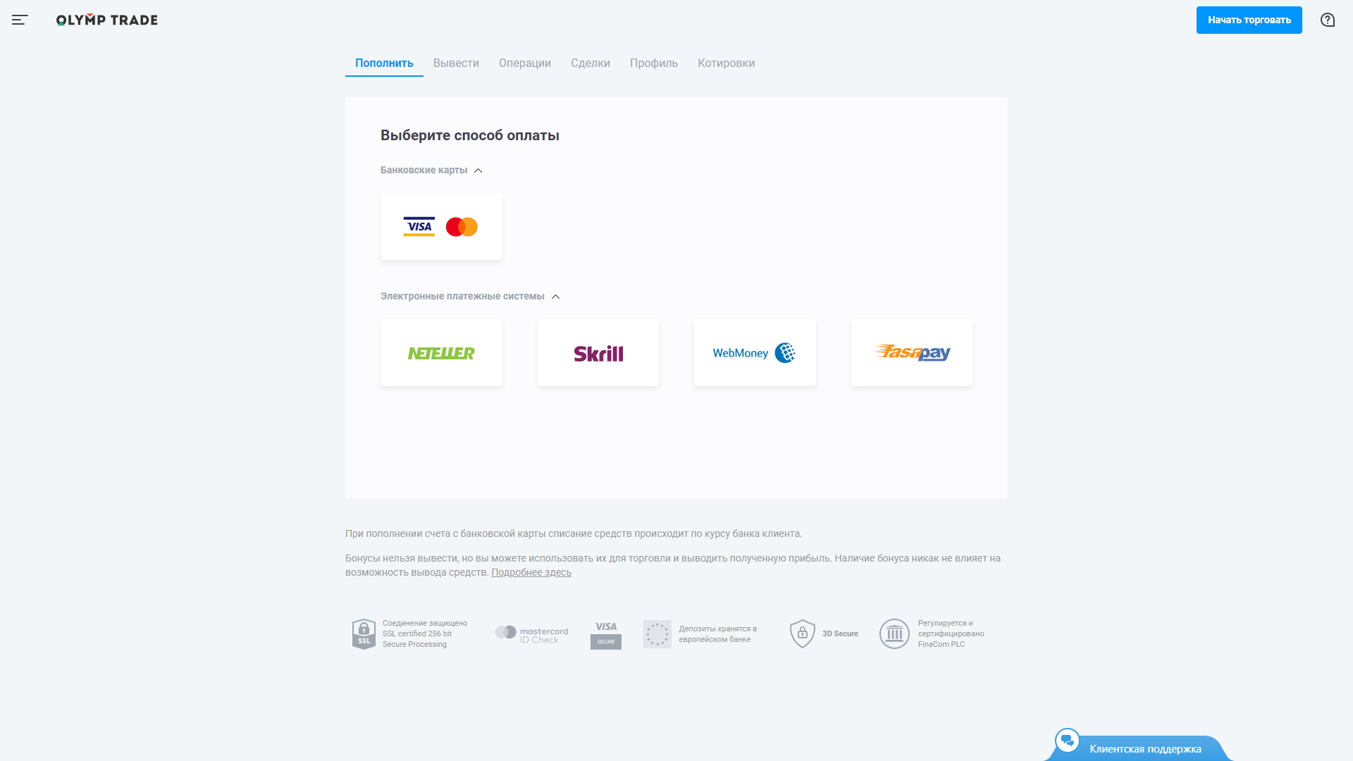 Ввод и вывод средств после регистрации счета у брокера Olymp Trade с помощью робота или VPN