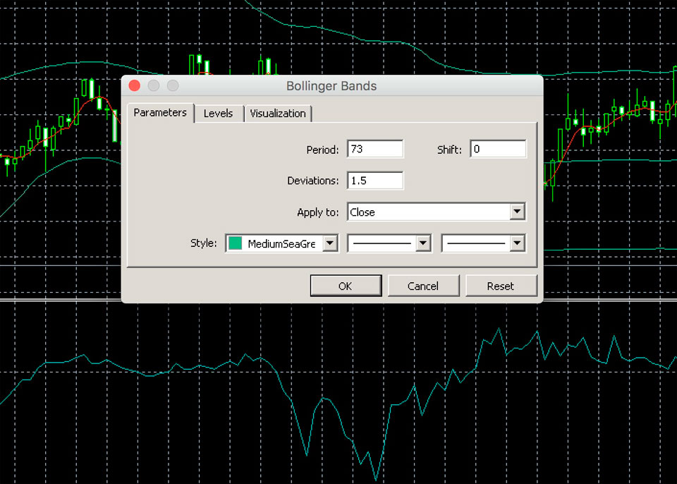 1. Bollinger Bands с такими настройками: период — 73, отклонение — 1,5; применяется к Close;