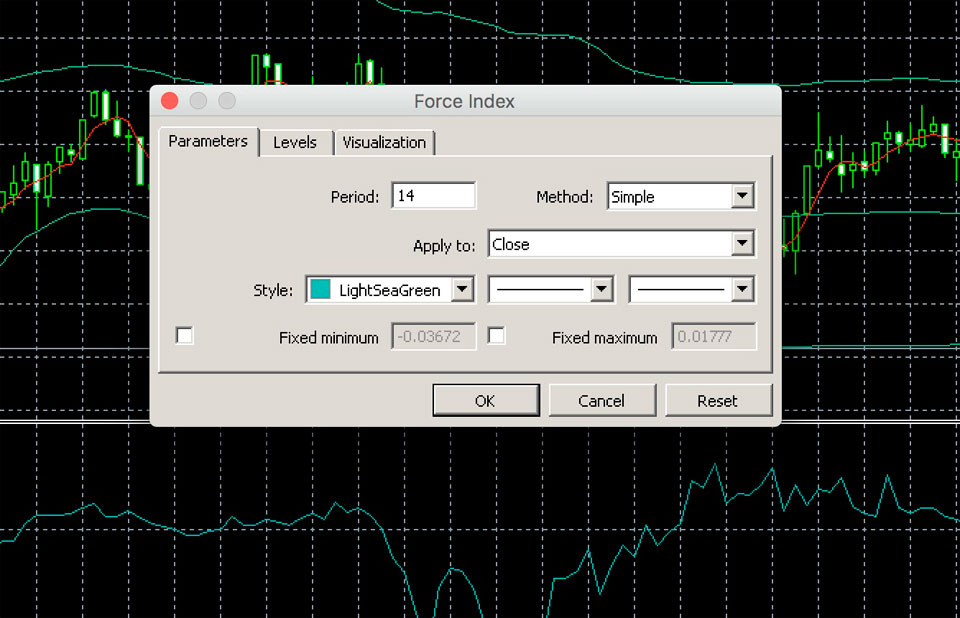 3. Force Index - осциллятор с настройками: период — 14, применимо к Close, метод — Simple.