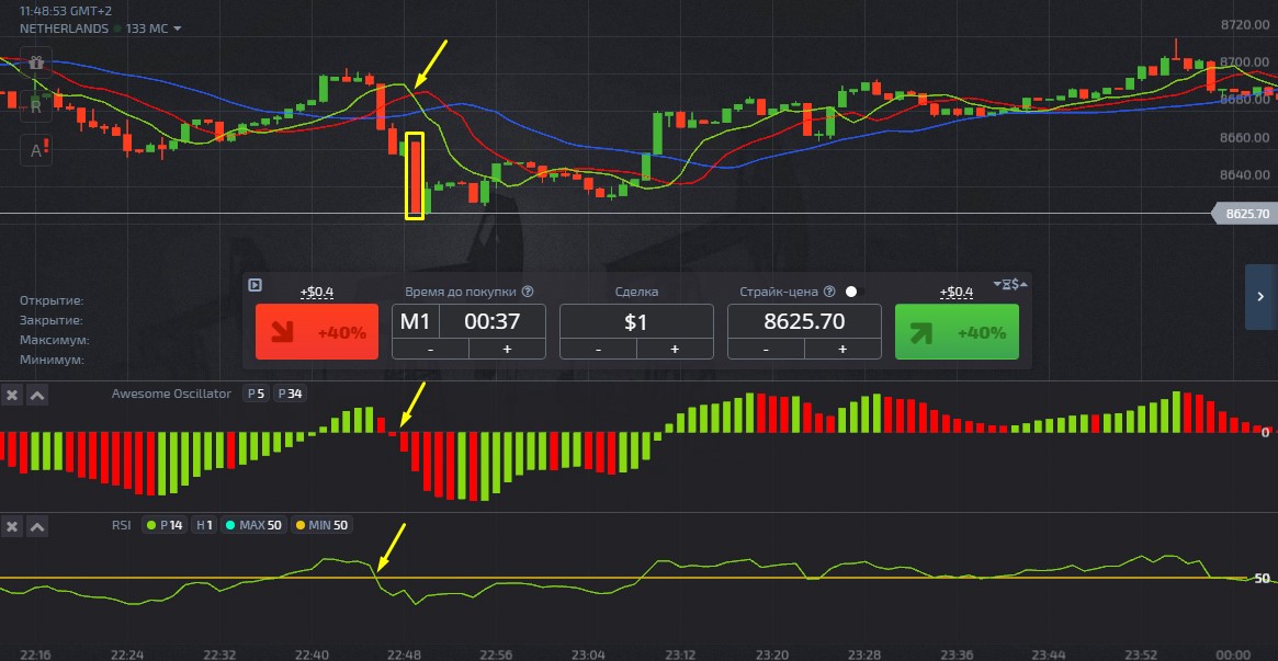 Одним из удачных методов работы с этими контрактами заключается в использовании сигналов, которые поступают от индикаторов Awesome Oscillator, Alligator и RSI. Каждый из этих инструментов встроен в торговый терминал, который предоставляет Покетопшн.