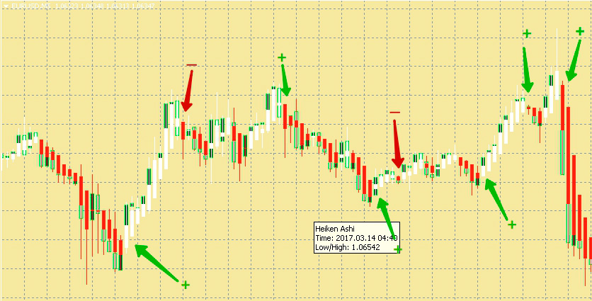При выборе интервала М15 и выше качество сигналов повышается, однако трейдер должен иметь определенные навыки, позволяющие распознать наличие тренда по форме свечей Heiken Ashi и размеру «хвостов».