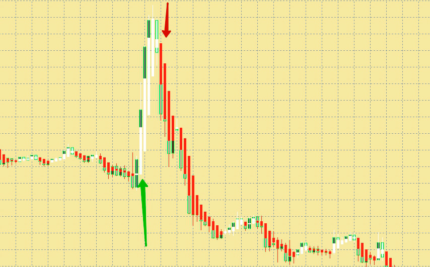 Постоянный поток исполняемых ордеров разделили на одинаковые временные отрезки — таймфреймы и «разбит» на «японские свечи», которые формируются, учитывая цену открытия каждого временного интервала. В течение фиксированного промежутка времени строится тело свечи. Более длинные «хвосты» - это экстремумы, наблюдавшиеся в течение данного интервала.