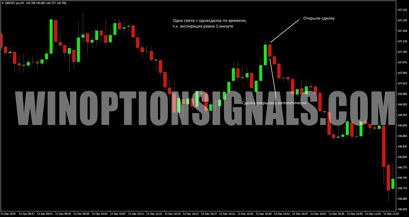 Так как стратегия предполагает работу с экспирацией 60 секунд на графике М1, каждая сделка будет соответствовать одной свече. Это означает, что если сделка открывается в самом начале формирования новой свечи, то она завершится одновременно с её закрытием.