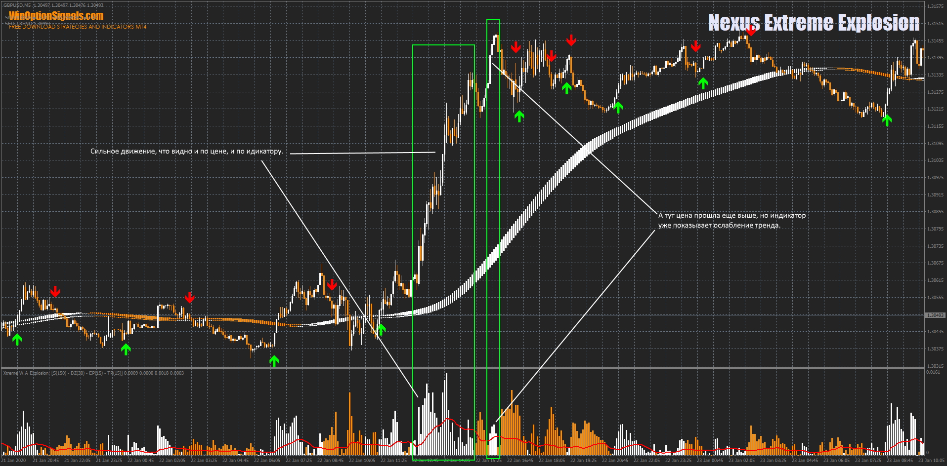 И пара слов об «подвальном» индикаторе Extreme W.A Explosion. Его стоит использовать только как дополнительный источник информации, который показывает силу направления цены и тренда. Чем сильнее движение, тем выше показания индикатора. Красная линия так же показывает силу движения, как в данном случае: