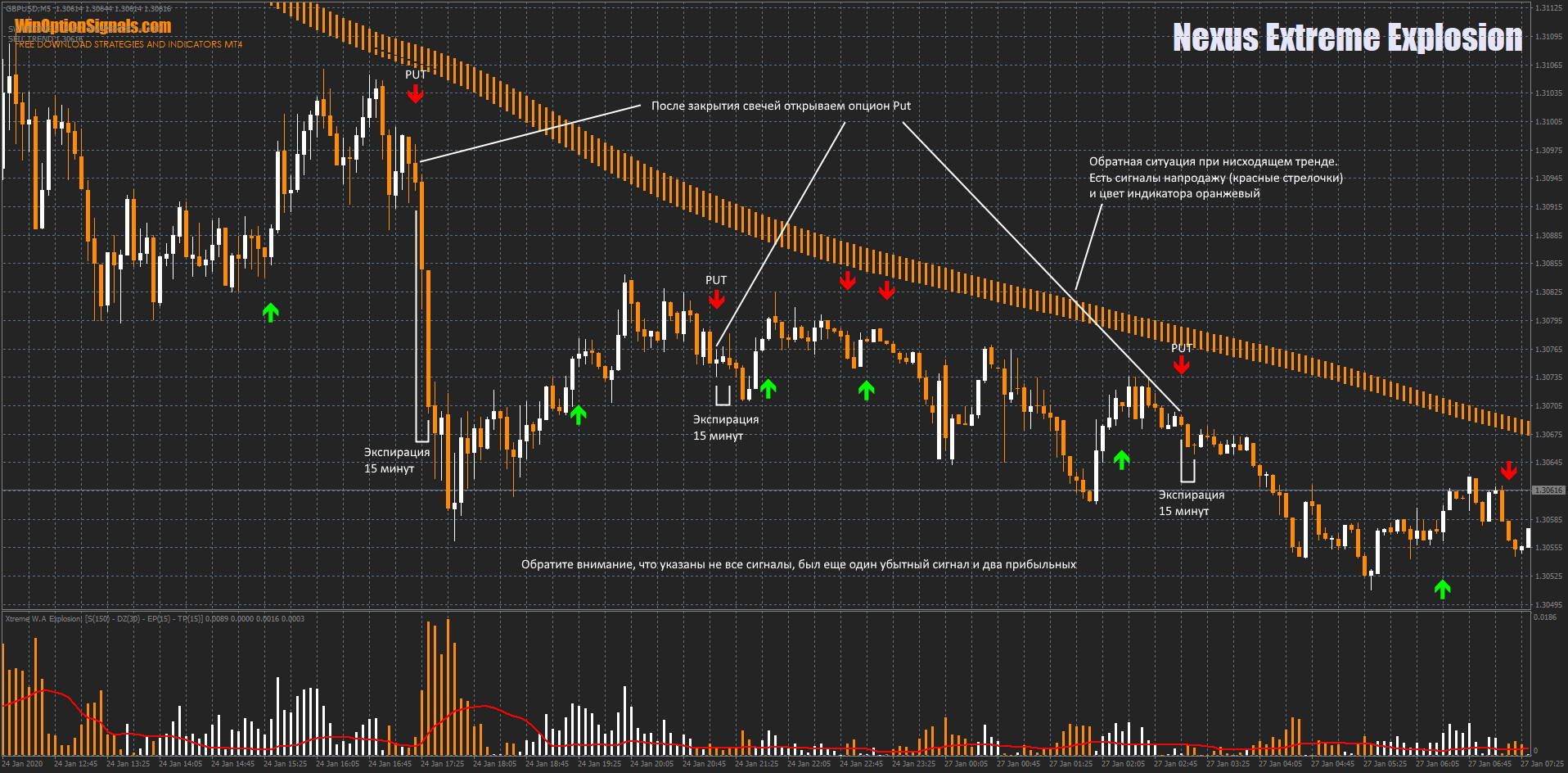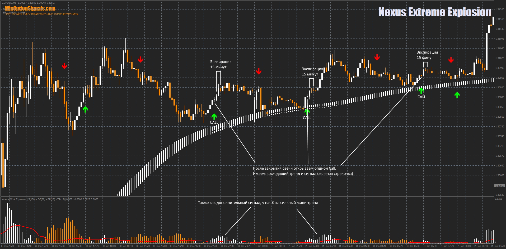 Стратегия для бинарных опционов Nexus Extreme Explosion представляет собой смесь трендовых индикаторов и одного сигнального индикатора, и используется для 5-минутных графиков и 15-минутной экспирации. В каждый индикатор данной стратегии заложен похожий друг на друга алгоритм работы. Основная суть этой стратегии заключается в том, чтобы совмещать сигналы всех индикаторов. А уникальность данной стратегии в том, что в ней используется индикатор силы тренда, который появился совсем недавно и еще мало кем опробован.