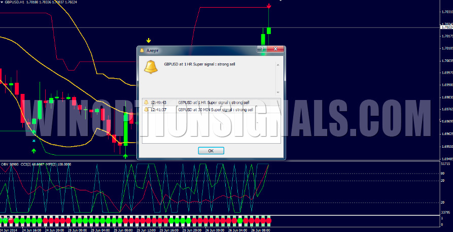 Стратегия показывает довольно неплохие результаты и выдает массу точных сигналов для бинарных опционов. Для вашего удобства в шаблон стратегии встроен Alert, который оповсетит вас о наличии сигнала.