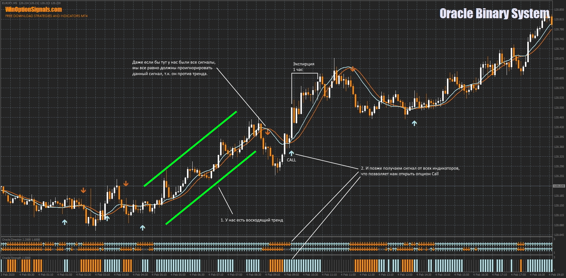 - Индикатор Oracle Strength должен показывать сильное движение, то есть должен быть сформирован оранжевый толстый столбец диаграммы.