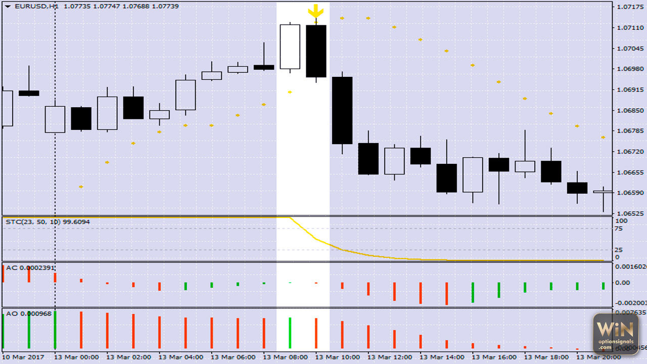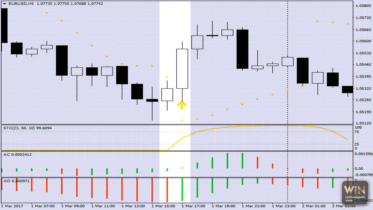 Открывать позицию следует после того, как свечка, на которой возник сигнал, закроется. Другими словами, если на графике отобразится стрелочка STC, совершаем покупку подходящего опциона на следующей свече.