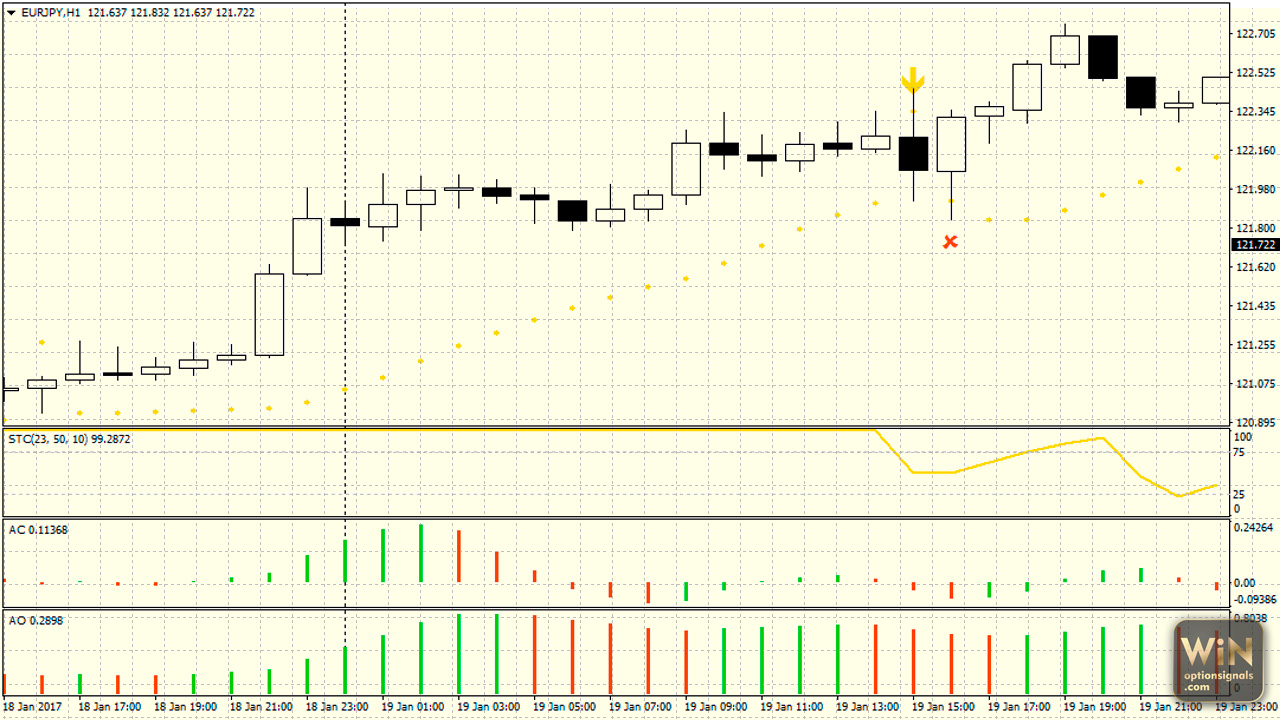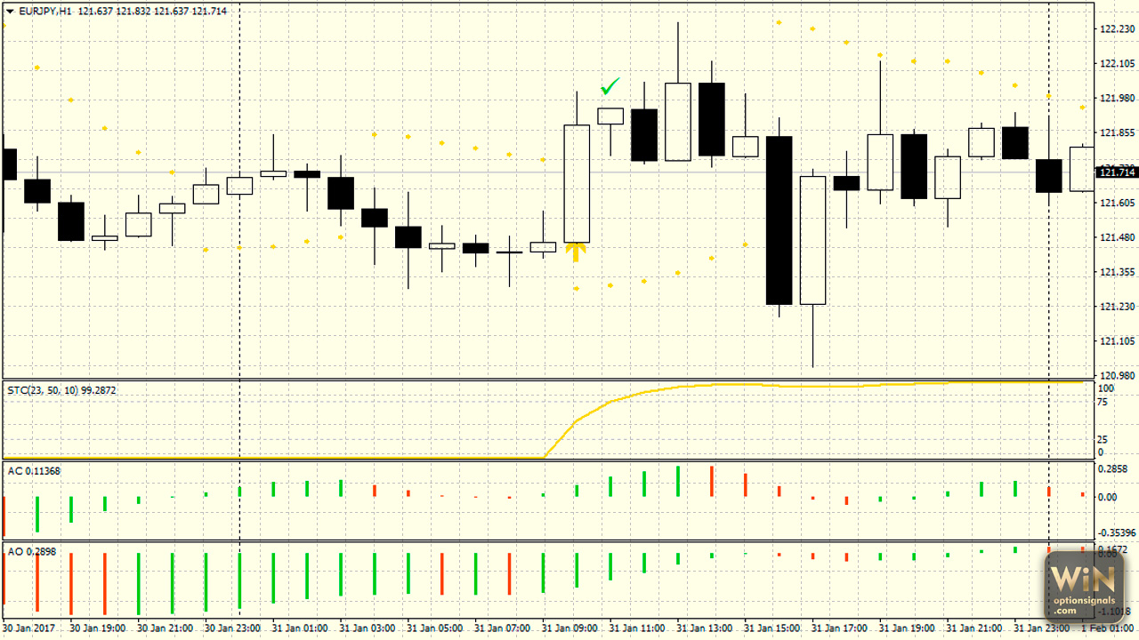 На рисунке ниже приведен пример входа на часовом графике EUR/JPY. Галочкой отмечена следующая от стрелки свечка – именно та, на которой мы открыли позицию. Судя по картине рынка вход был не из лучших, но принес свои плоды.