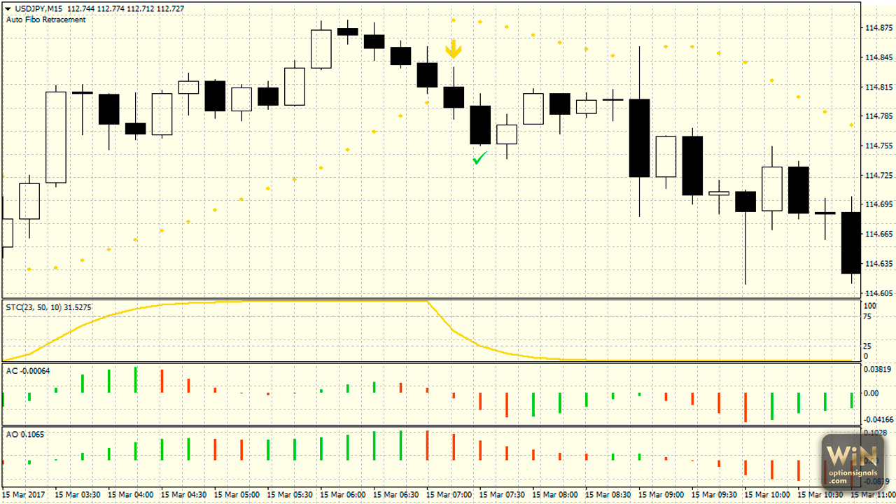 В случае, когда направление входа совпадает с направлением общего тренда, сделка может быть очень успешной. Такой пример показан на скриншоте с пятнадцатиминутным графиком USD/JPY.
