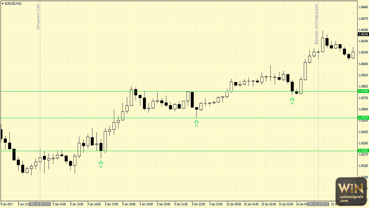 Допустим, нами было принято решение разбить позицию на три части. Первый опцион приобретается на вершине, и цена начинает падать. Что в такой ситуации нужно предпринимать? Нам нужно отыскать уровни поддержки на графике и дождаться момента, когда цена к ним опустится. При касании ценой поддержки покупает еще один опцион в аналогичном направлении с тем же сроком экспирации. И чем больше опционов нам удастся купить ниже уровня прогноза, тем выше шанс на получение прибыли. С помощью таких несложных манипуляций производится усреднение позиции за счет открытия дополнительных опционов по более выгодной цене.