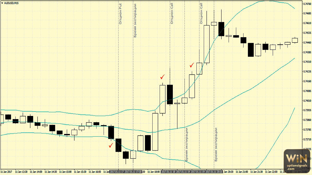 Рассмотрим стратегию, в основе которой лежит использование полос Боллинджера. Правила входа следующие: При закрытии свечи или бара за пределами канала покупаем опцион в направлении пробоя. Время экспирации берем в два раза больше от рабочего ТФ. При работе на графике М15 экспирация должна быть 30 минут.
