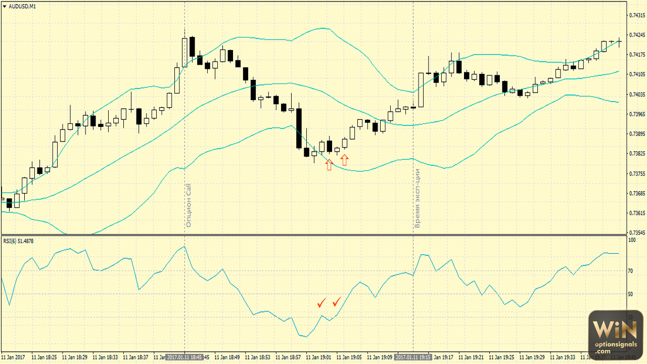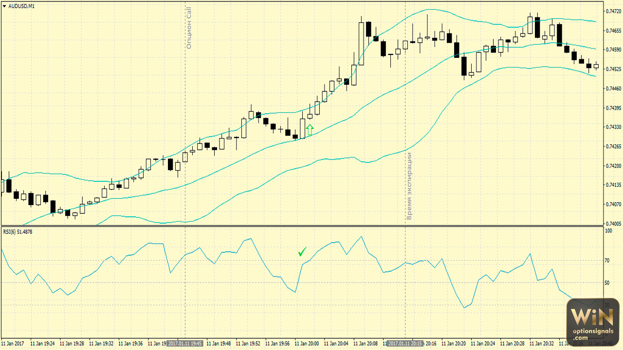 При покупке первого опциона цена пошла в нужном нам направлении. Доливку будет производить при входе кривой RSI в зону перепроданности. Такой подход является немного нестандартным, но его можно обосновать. В нашем случае цена должна получить хороший импульс для того, чтобы мы смогли купить дополнительный контракт в том же направлении.