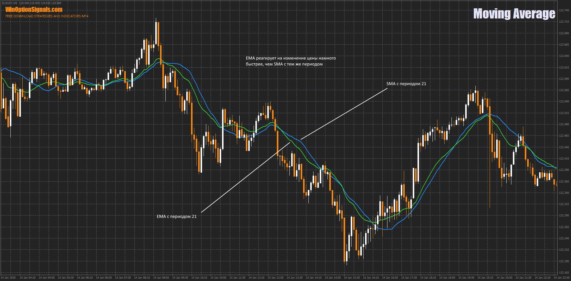 Когда Скользящие Средние используются для генерации сигналов на основе направленного движения для открытия опциона Call или Put на валютной паре, основная концепция заключается в том, что трейдеры в то, что прошедшее ценовое движение продолжится в будущем.