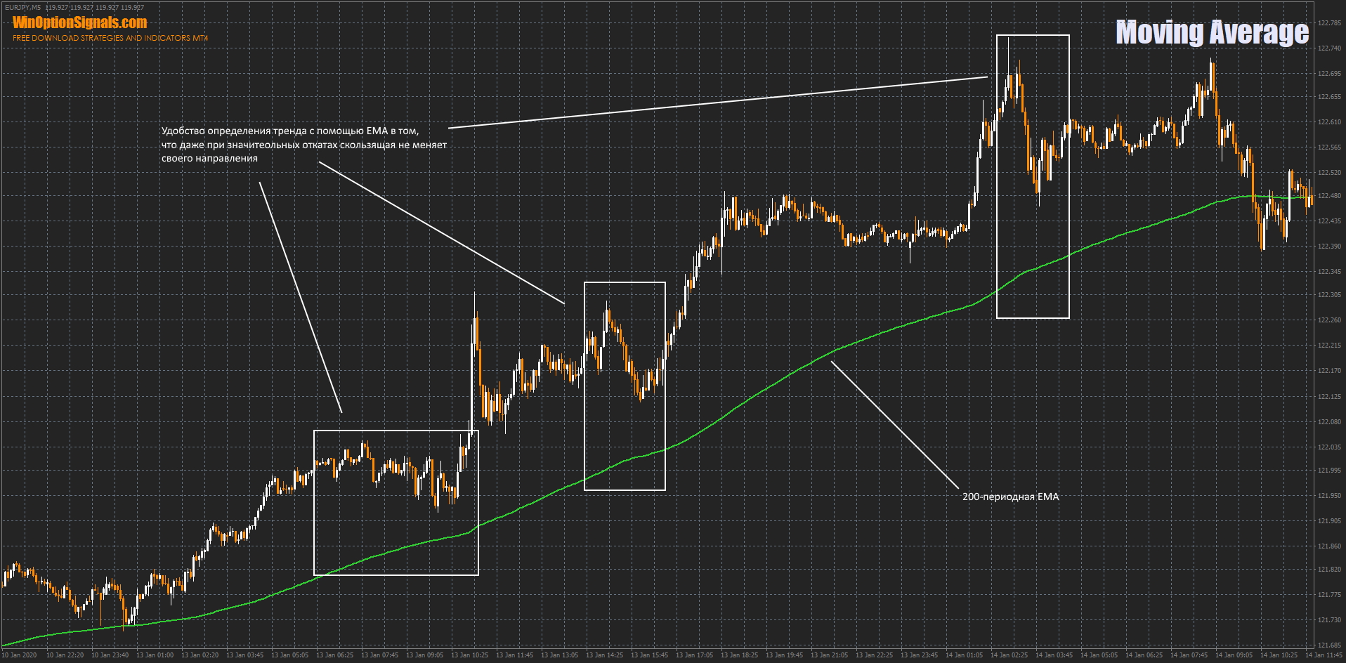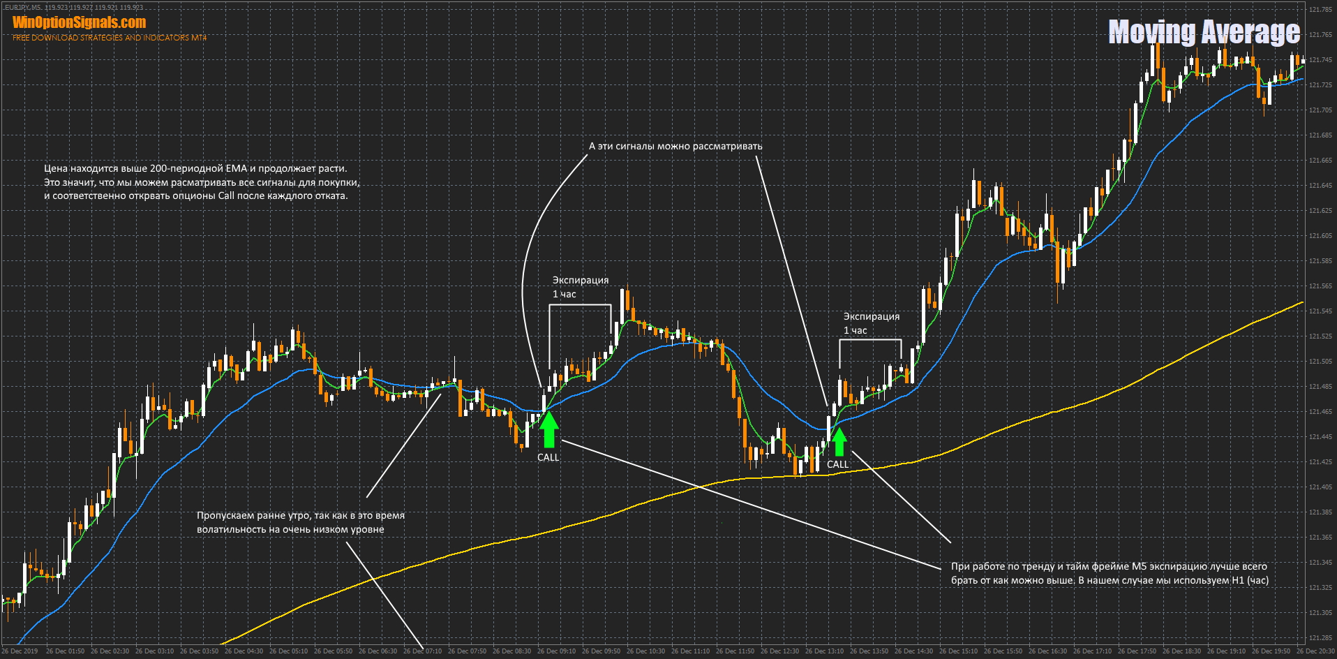 Проблемой при работе по тренду является то, что цена не может бесконечно идти в одном направлении без откатов. Во время восходящего тренда торговый актив может начать корректировать не раз, что путает трейдеров. На картинке ниже пример такого движения на валютной паре EUR/JPY, где при восходящем долгом тренде на тайм фрейме М5 мы можно наблюдать множество откатов, после которых тенденцию возобновляется снова. При использовании 200-периодной EMA становится видно, что при откатах средняя не меняет своего направления, что говорит о продолжении тренда. Это в свою очередь дает возможность повторно открывать опционы Call.